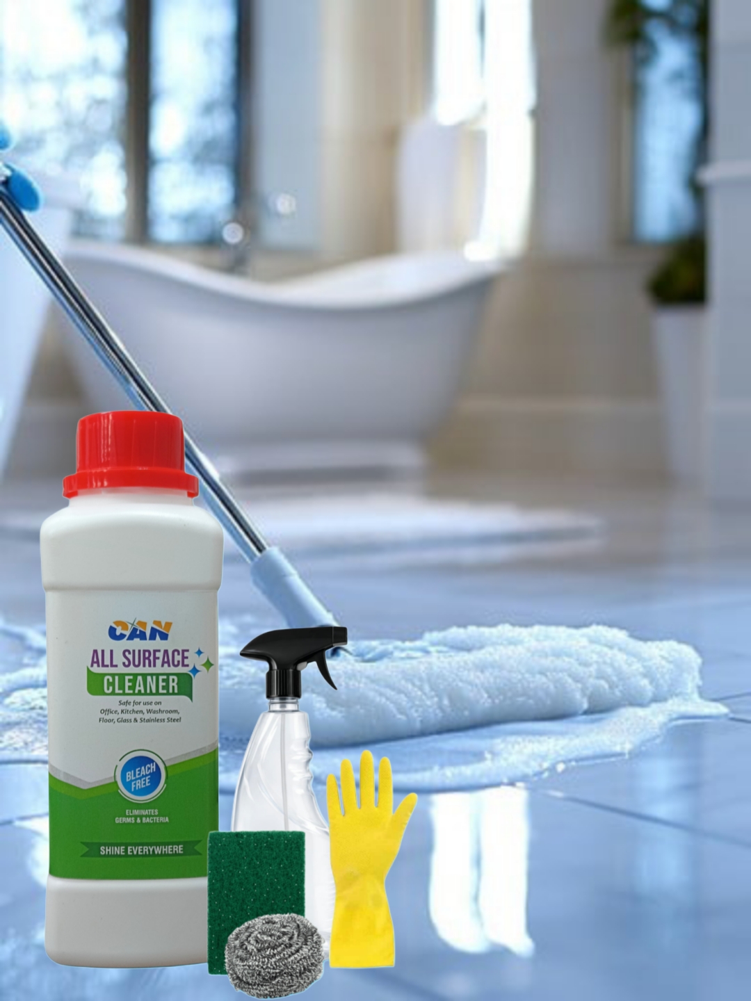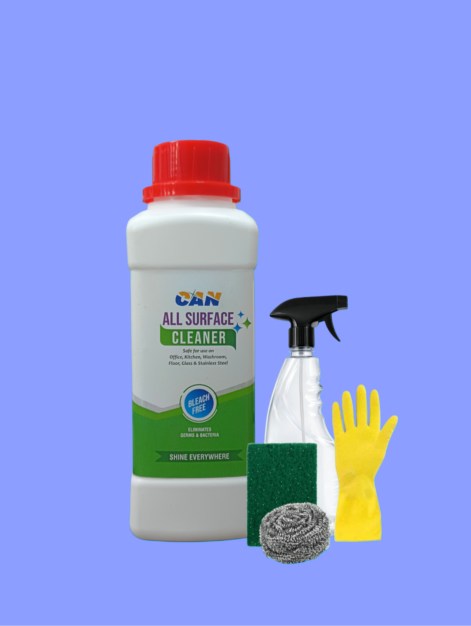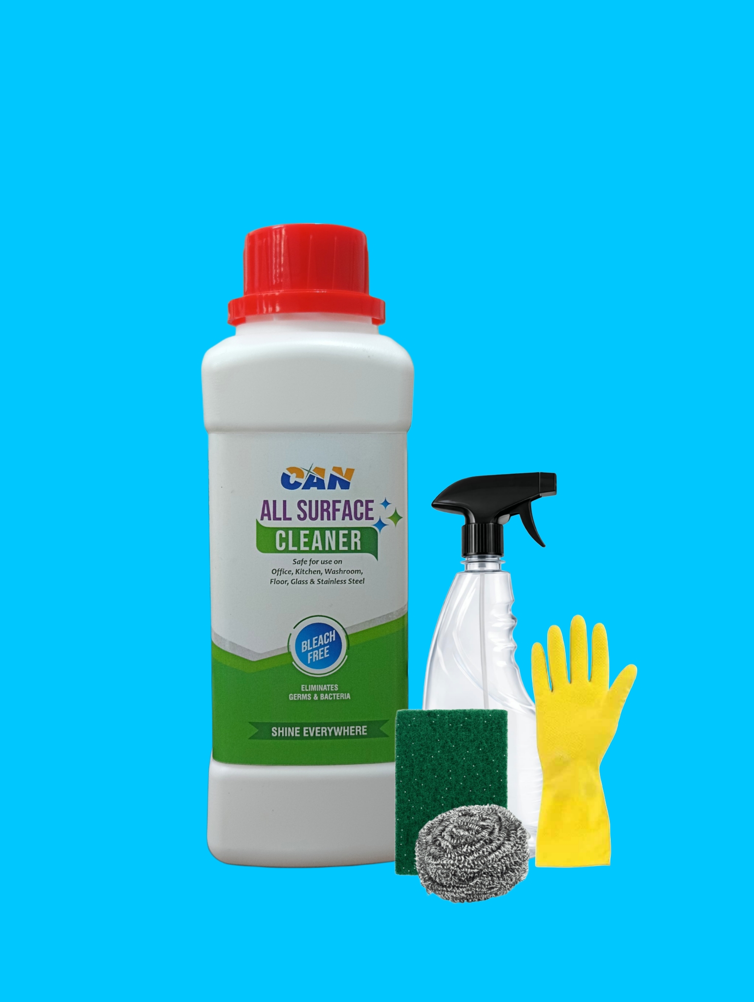 The All Surface Cleaner Combo 250 ML includes a powerful scrubber, an easy-to-use spray bottle, protective gloves, and a durable steel roll for effective and convenient cleaning.